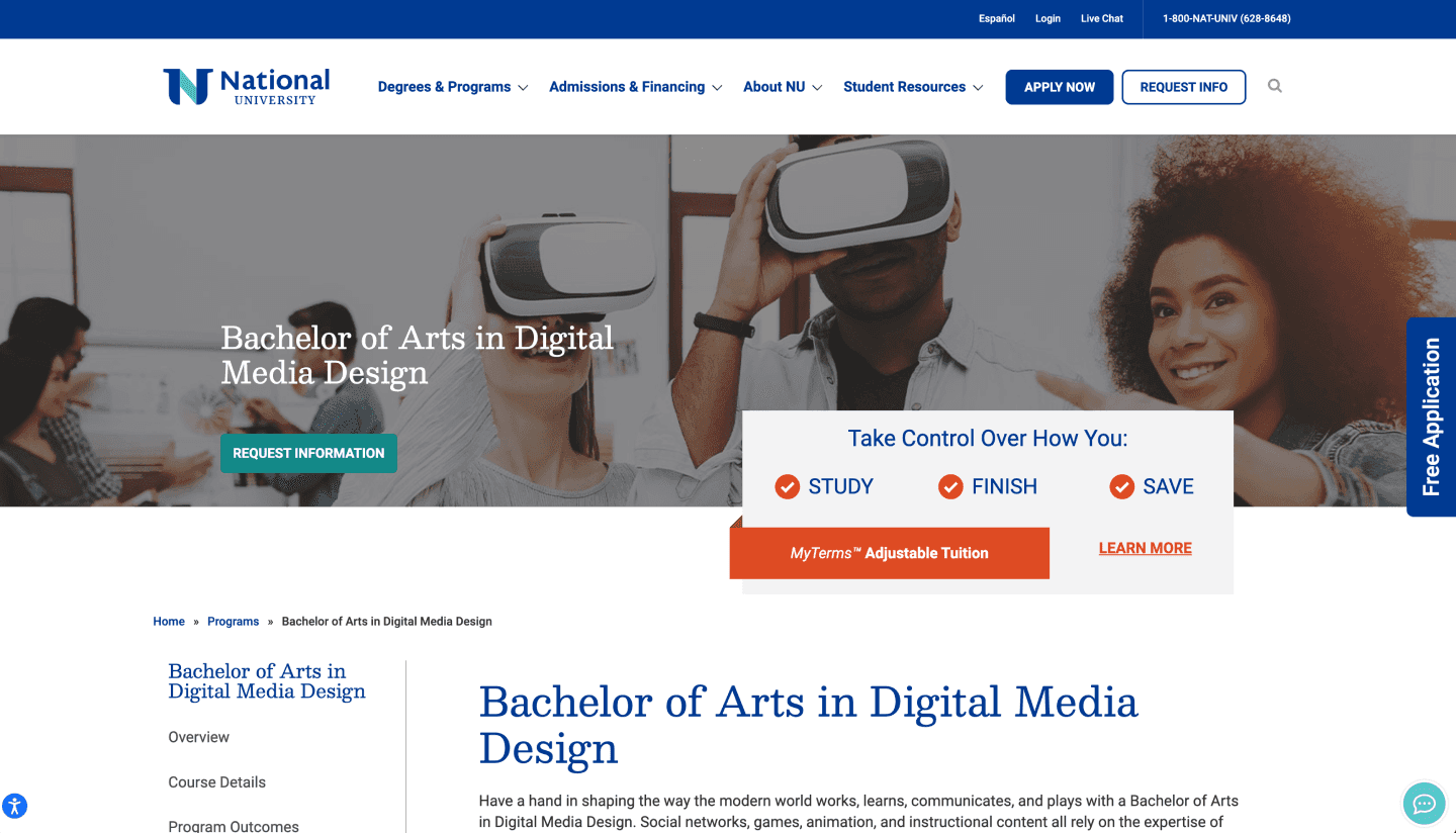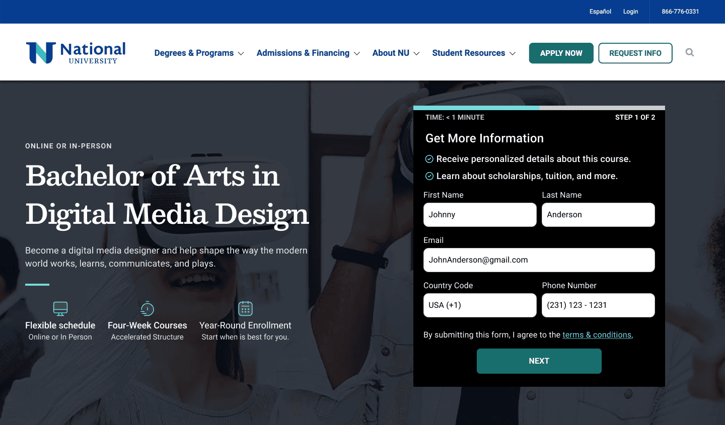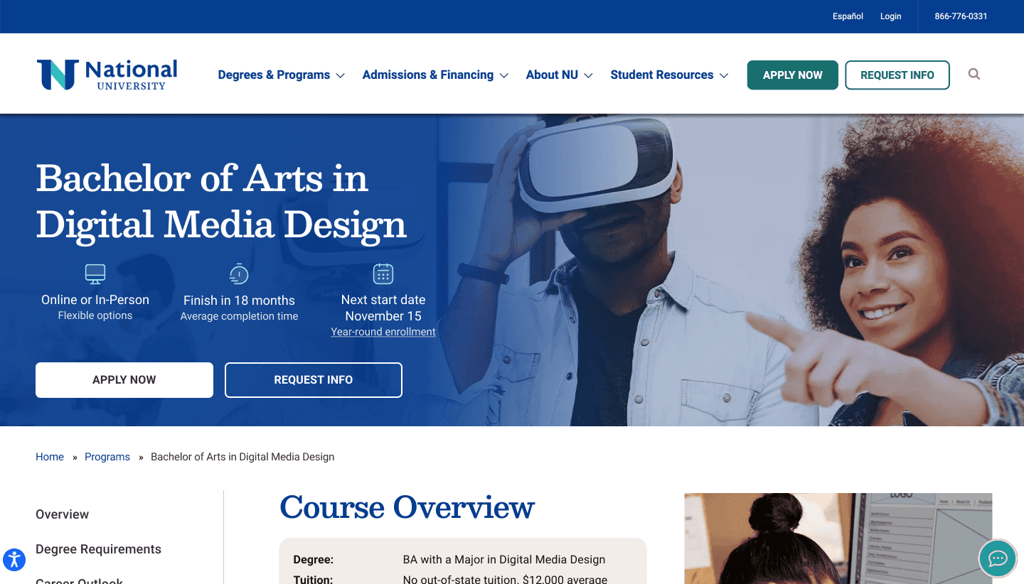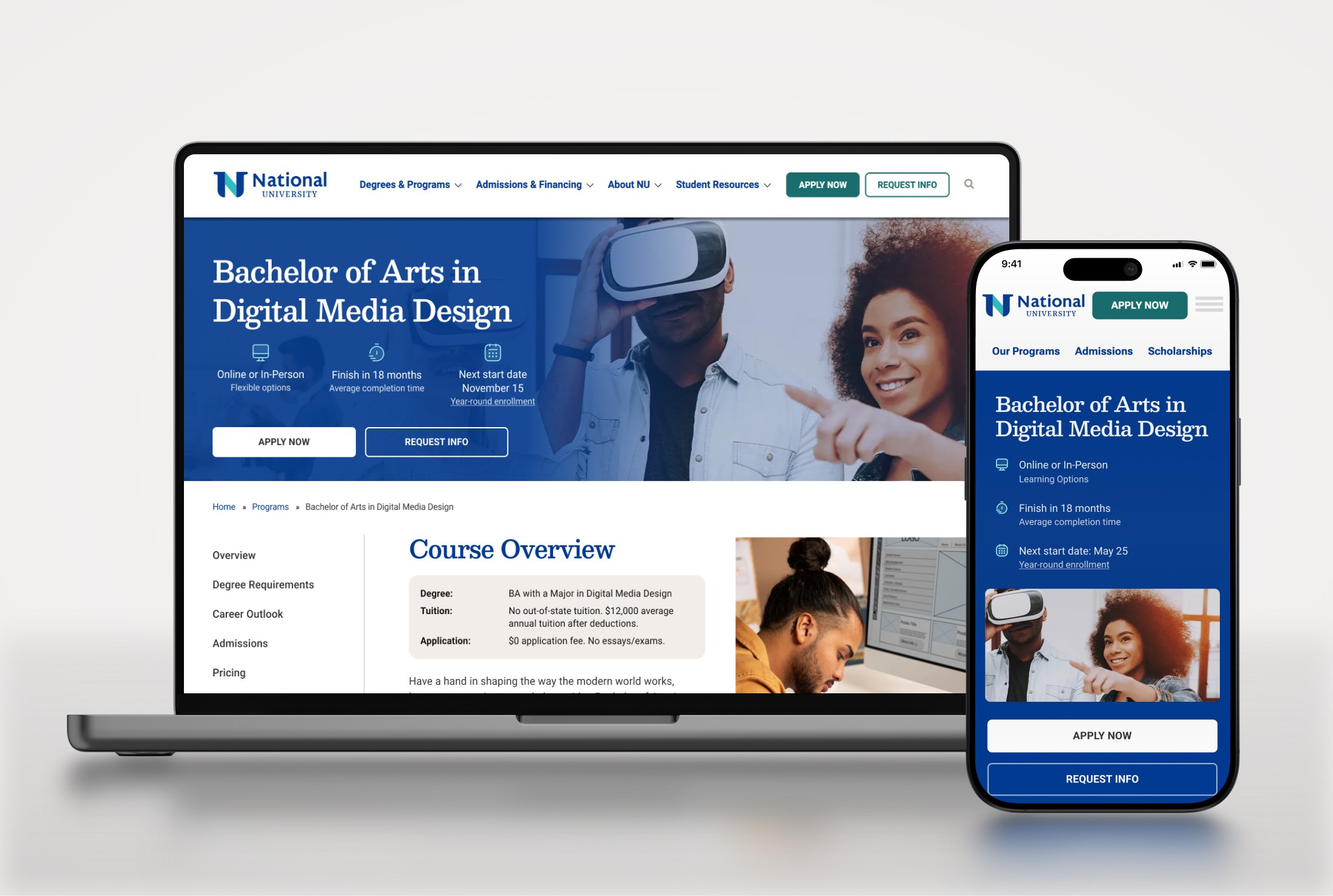 Redesign the program landing pages that serve as the primary conversion funnel for prospective students exploring National University's degree offerings. These pages needed to more effectively communicate program details, career outcomes, and tuition information — while improving request-for-information and application start rates.