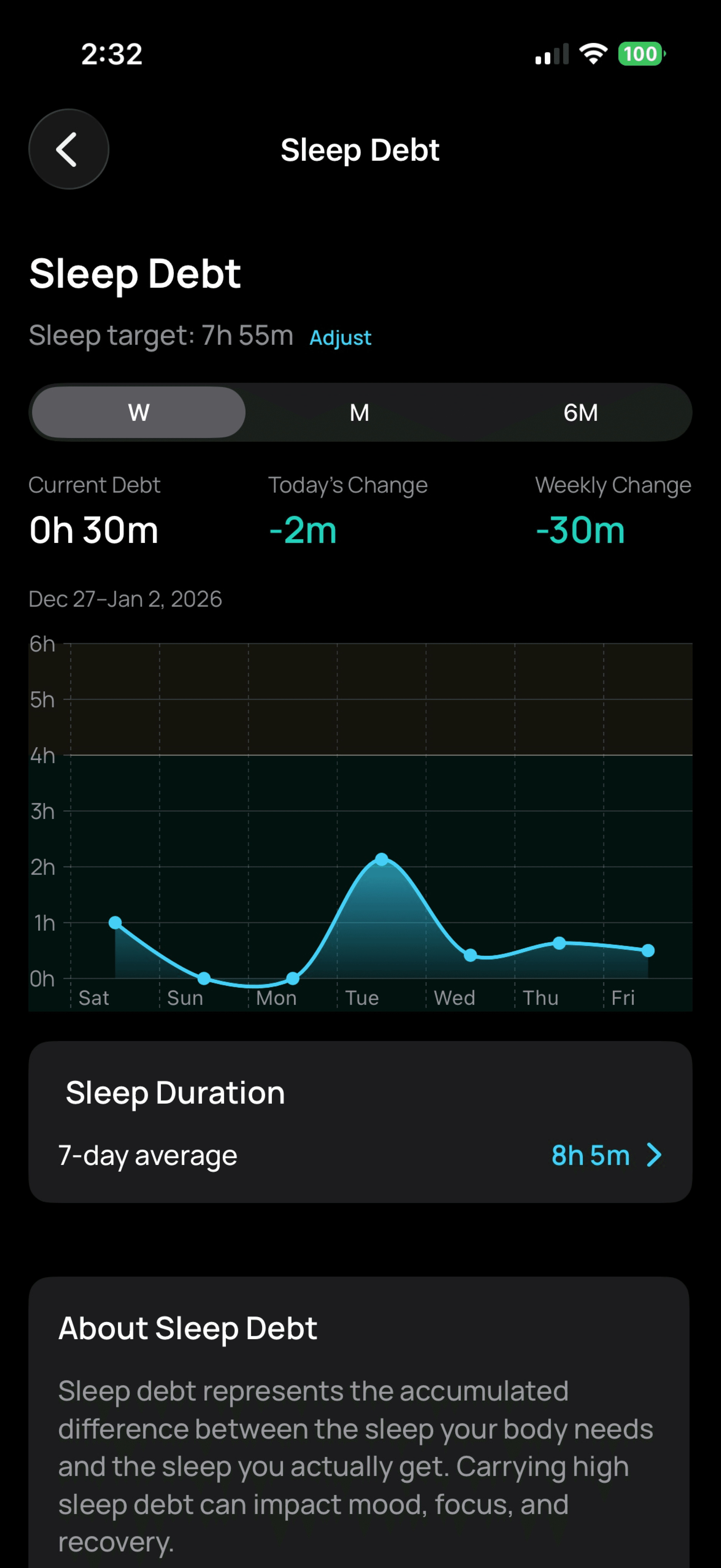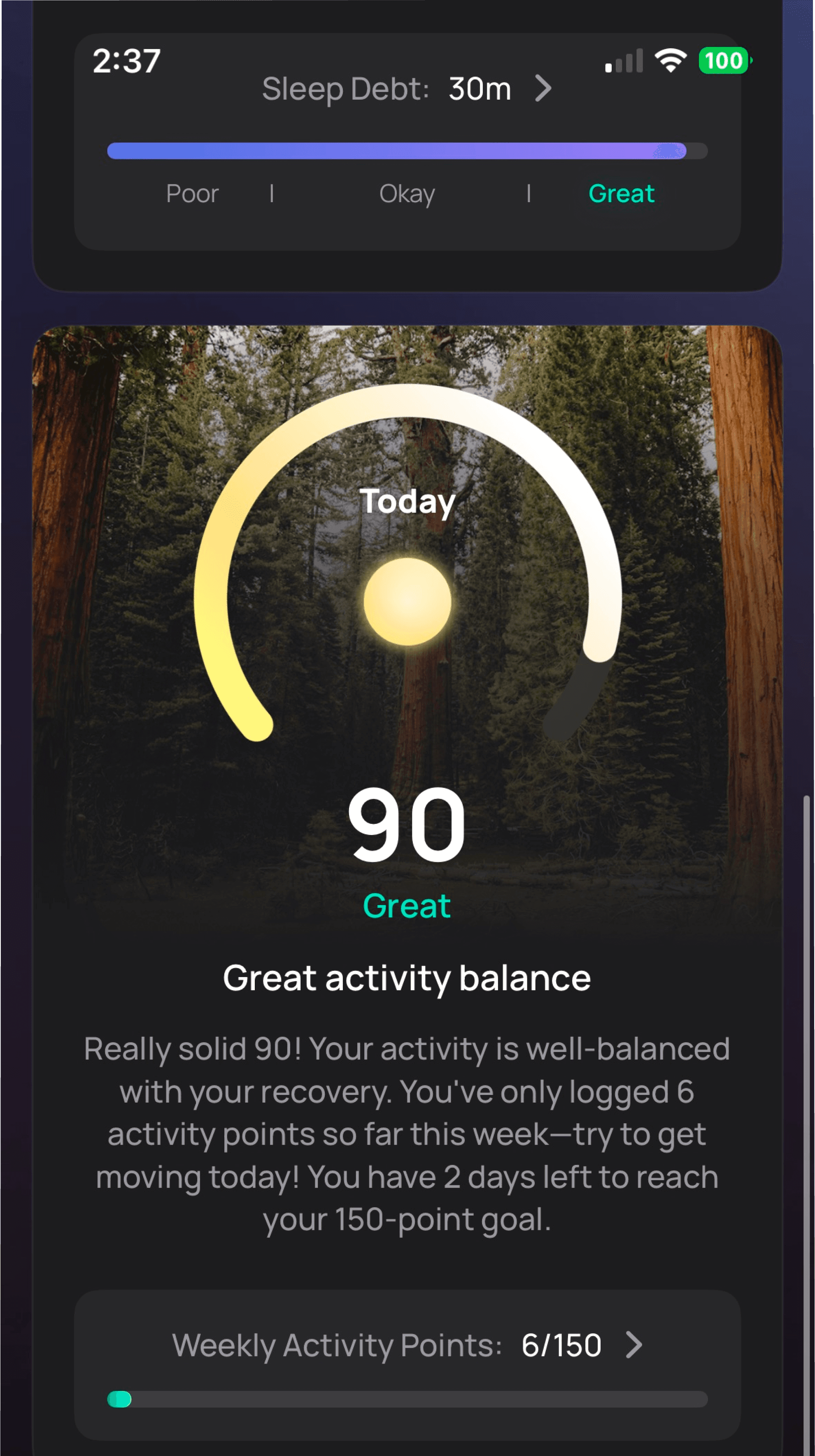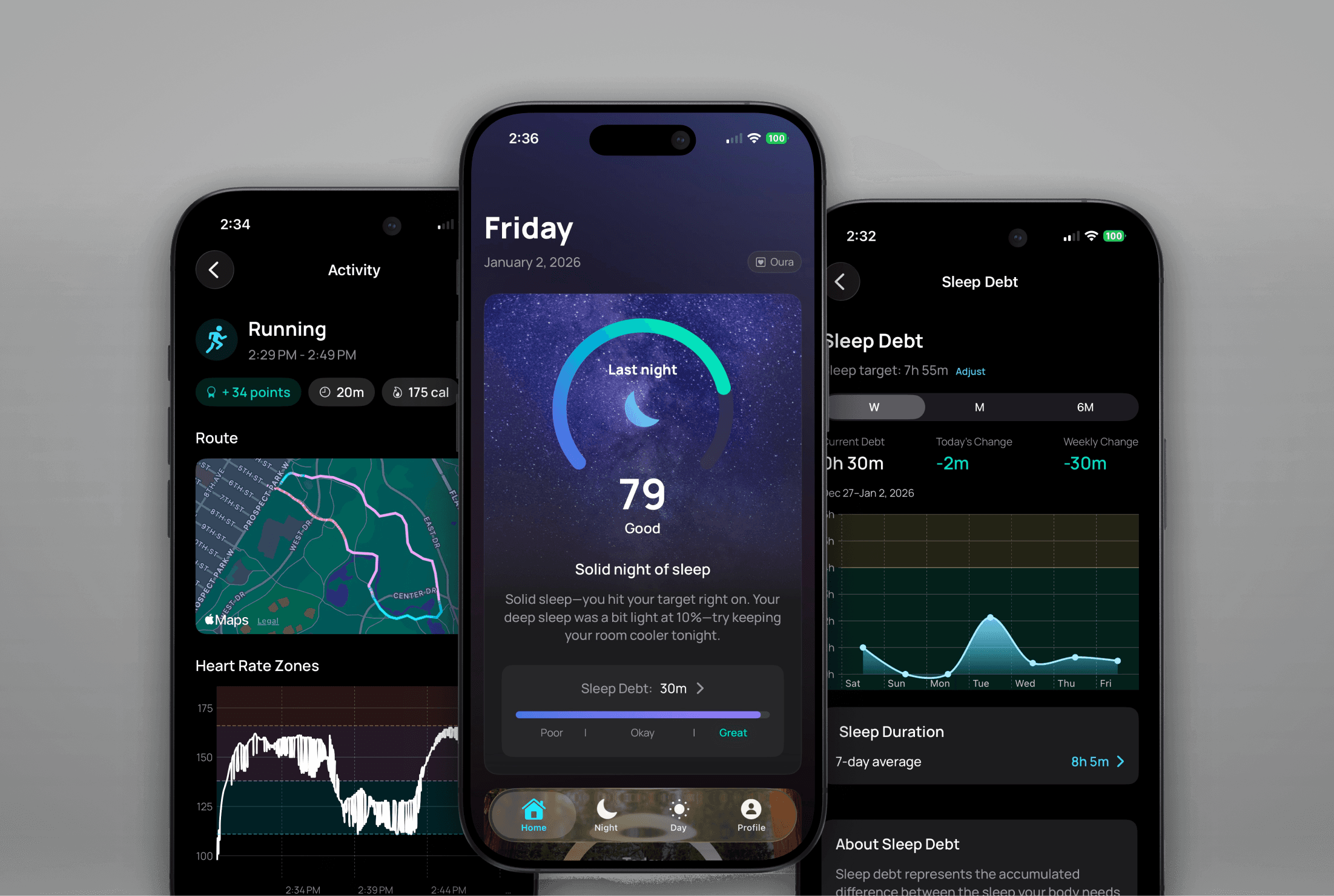Beautiful UI, excellent sleep and readiness insights. But requires a $300+ ring plus a subscription, its sleep debt implementation isn't customizable or prominently featured, and it doesn't track weekly activity in the way I was looking for.