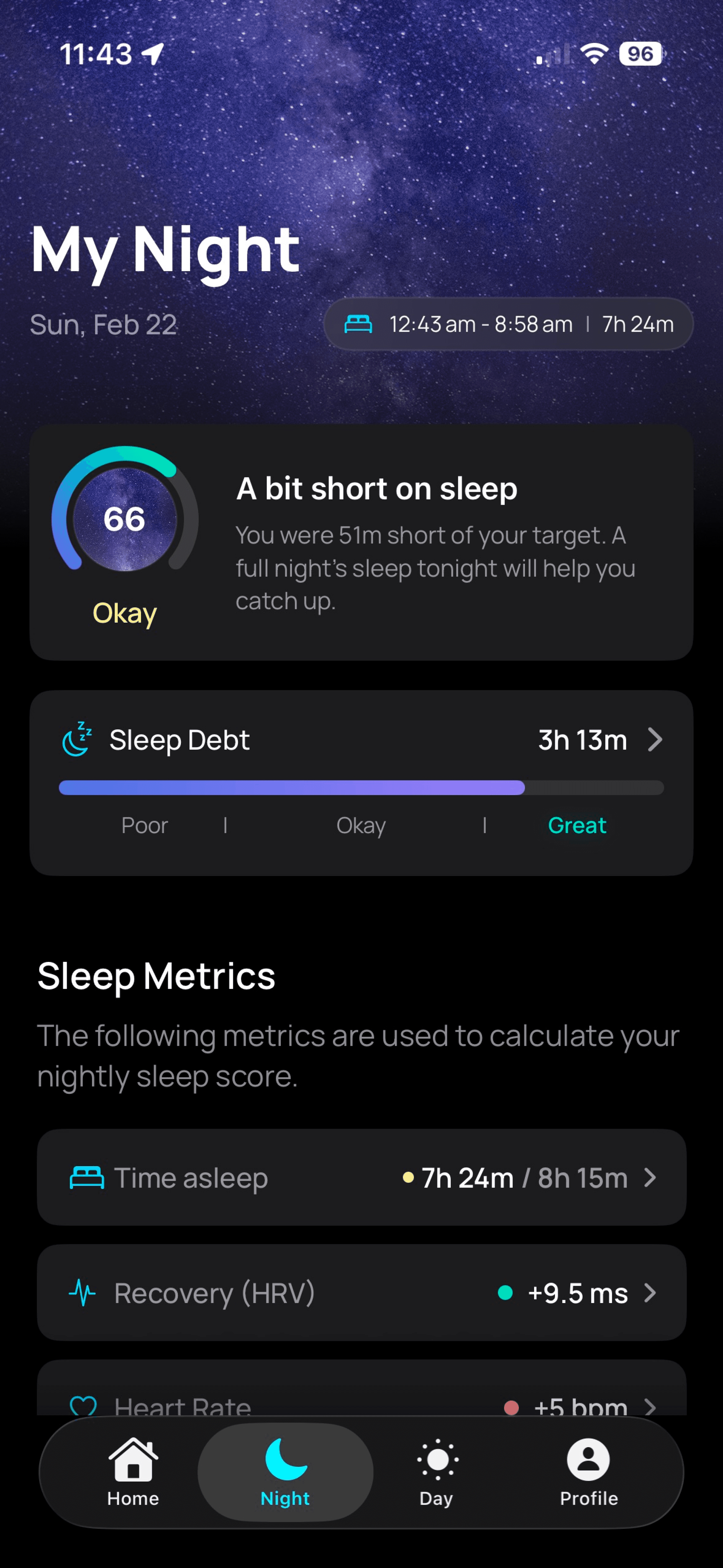 A running balance of accumulated sleep deficit, tracked against a user-defined sleep goal. Unlike competitors that allow "sleep credit" (which isn't scientifically valid), Night & Day only tracks debt — you can pay it back, but you can't bank sleep. This mirrors the science: sleep debt is arguably the most important long-term health metric the app tracks.