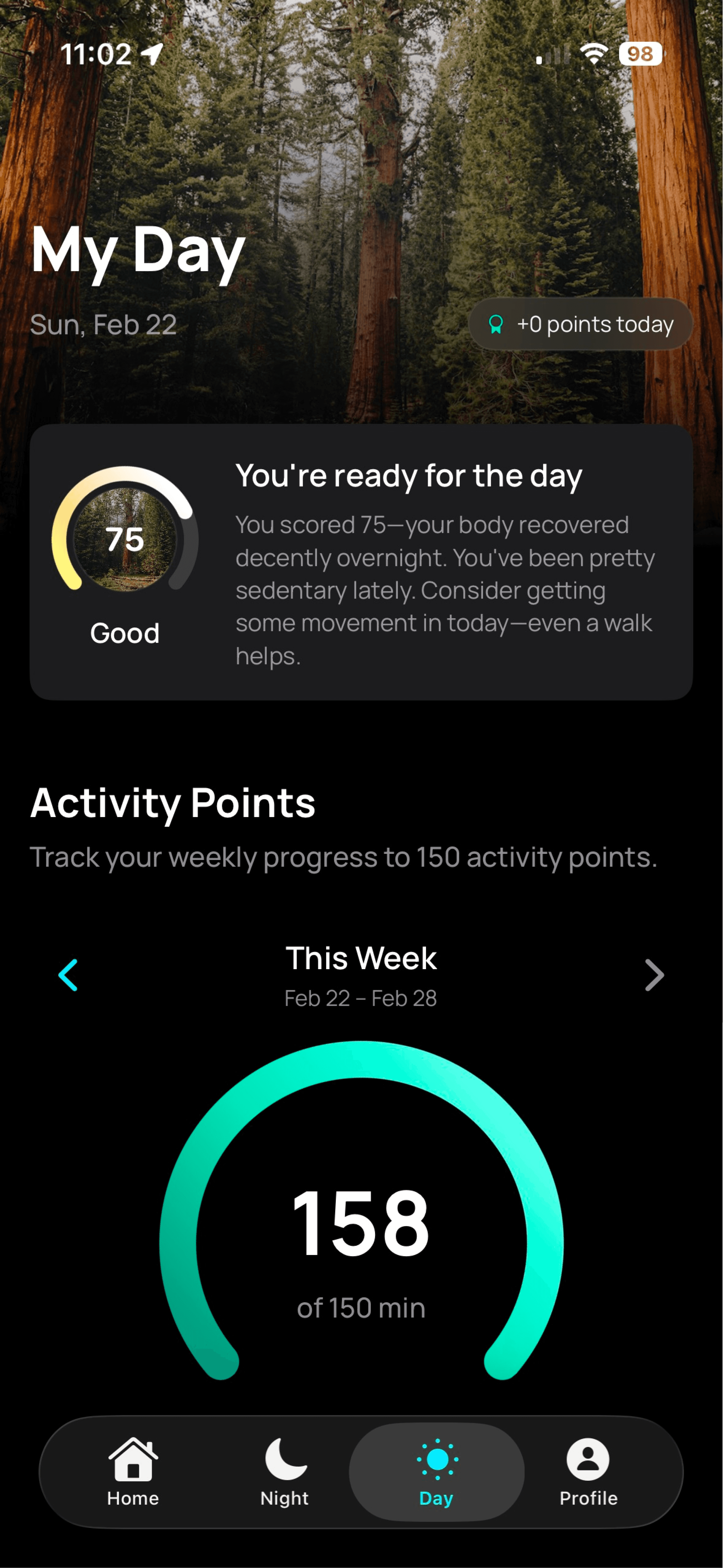 A weekly activity metric directly based on the World Health Organization's guideline of 150 minutes of moderate-intensity aerobic activity per week. Every minute of elevated heart rate earns points, with vigorous activity earning double — matching the WHO's finding that vigorous exercise delivers roughly twice the health benefit per minute. Most fitness apps set arbitrary daily goals (Apple's "close your rings" being the most prominent example), but there's no scientific basis for requiring the same activity level every single day. A weekly target reflects how real people exercise: some days are hard, some are rest days, and that's healthy. This reframing was a core design decision.