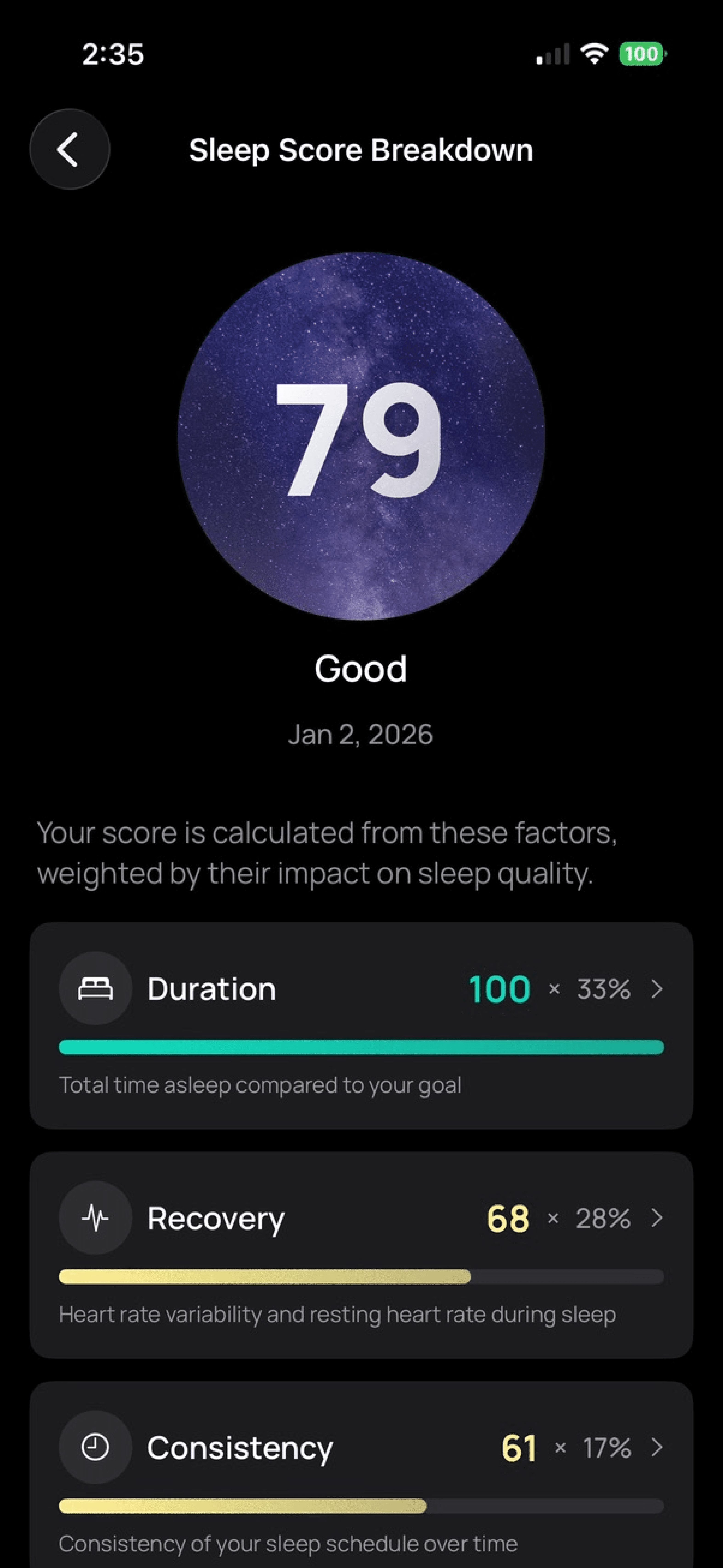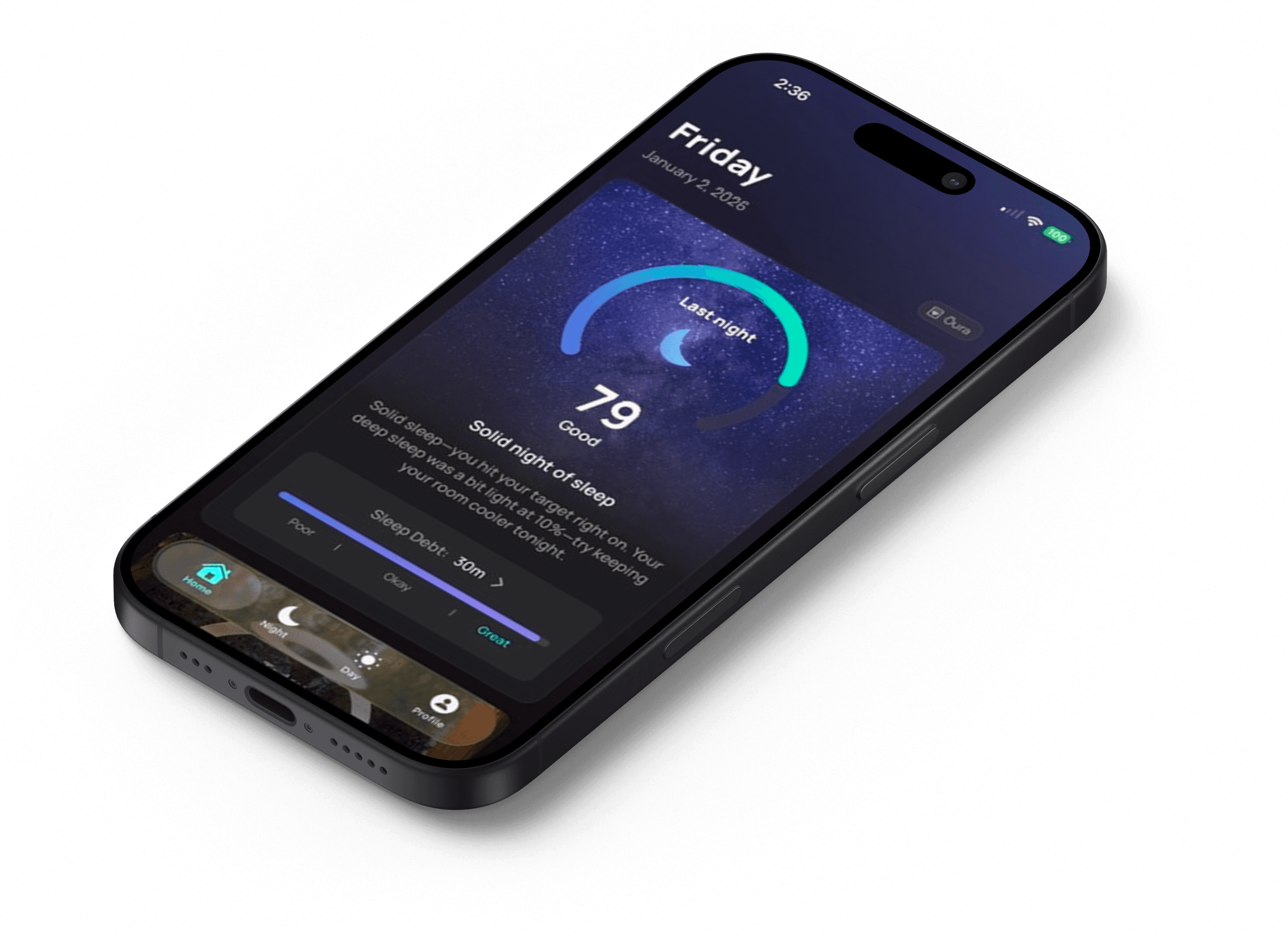 A nightly composite score analyzing duration, efficiency, consistency, sleep stages, and recovery markers. The challenge was making this feel personalized rather than generic — the score needed to reflect your night relative to your baseline, not an arbitrary standard.