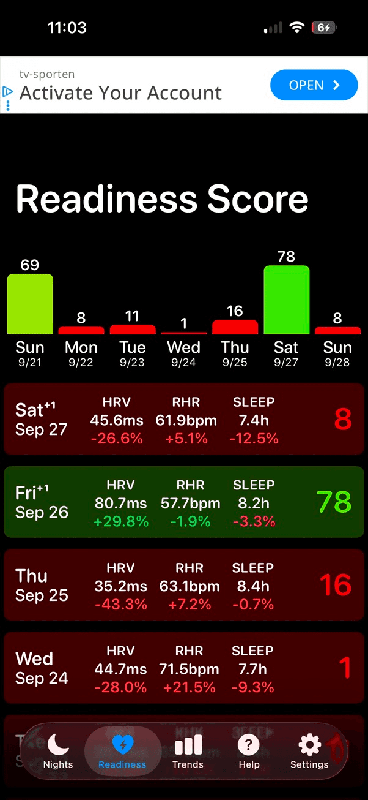 A popular option in the free tier. Suffered from heavy and dense UI while lacking easily actionable insights. Also missing was sleep debt tracking. Their readiness scoring logic was overly harsh and resulted in scores of "0".