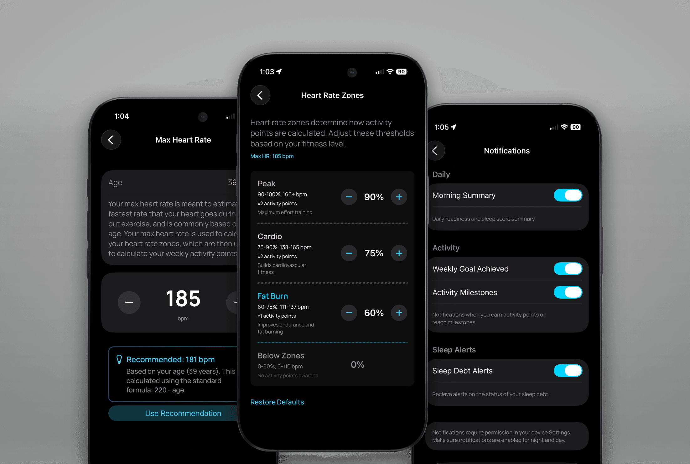 Notifications were designed as a lightweight engagement layer — a morning readiness summary, alerts when sleep debt crosses certain thresholds, confirmation when activity points are logged, and a weekly goal completion celebration. During testing, one notification type (sleep debt cleared) was producing false positives, so I disabled it for launch rather than shipping something unreliable. This kind of restraint — knowing when to ship less — was an important part of earning user trust early on.