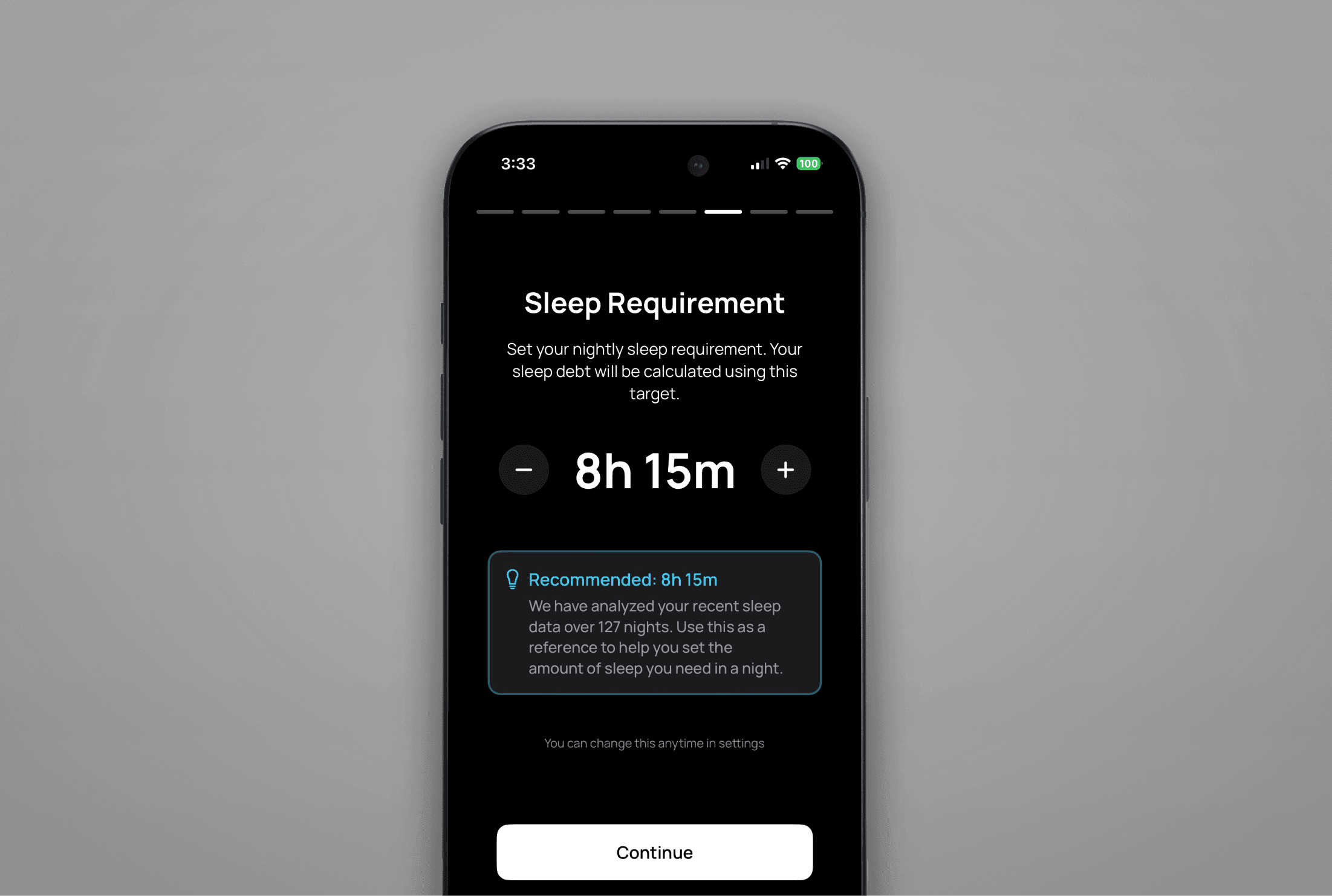 The app analyzes existing sleep data to suggest a personalized sleep target, which users can adjust to match their needs. A quick onboarding guides users through this step, which can be revisited in settings.