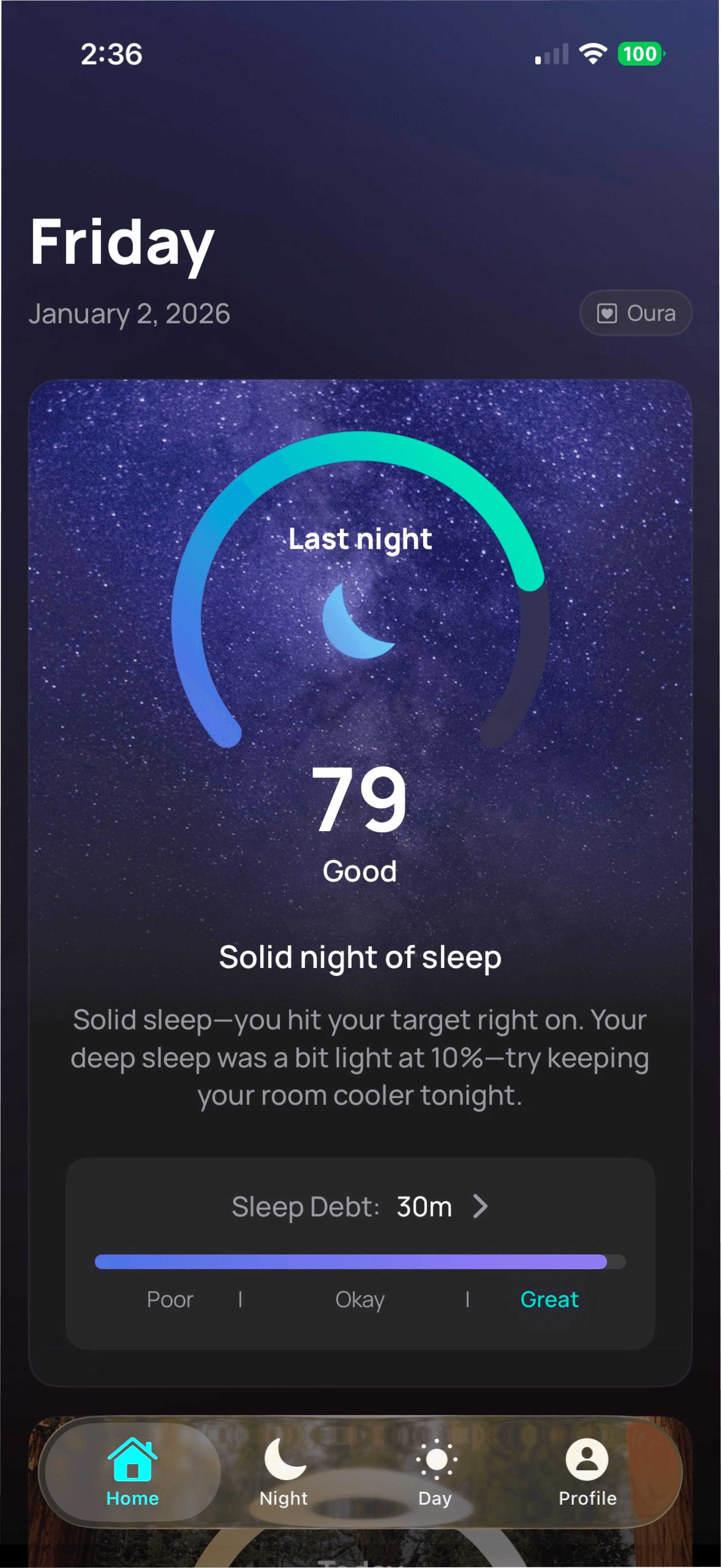 The biggest design challenge was the insight prioritization system. Rigid rules created messaging that felt robotic and often wrong; severity-based, context-aware logic created messaging that matched real life. This required constant iteration using my own sleep data as a testing ground — a unique advantage of designing a product I use every day.